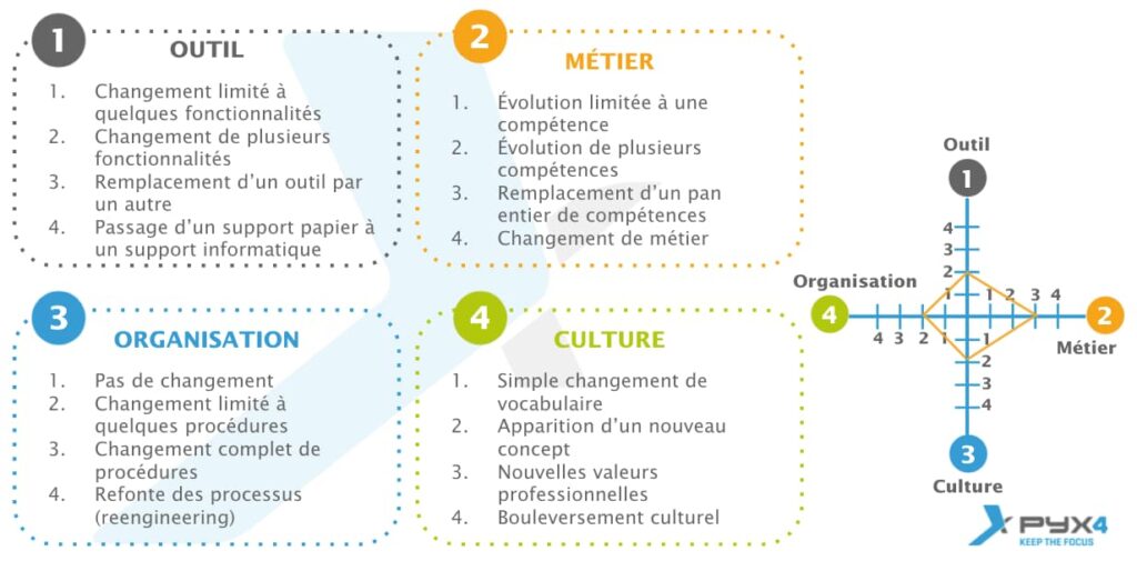 Pour structurer cette réflexion, vous pouvez vous appuyer sur l’outil OMOC (Outil, Métier, Organisation, Culture). Il permet de positionner l’organisation sur chacun des quatre axes sur une échelle de 1 à 4.