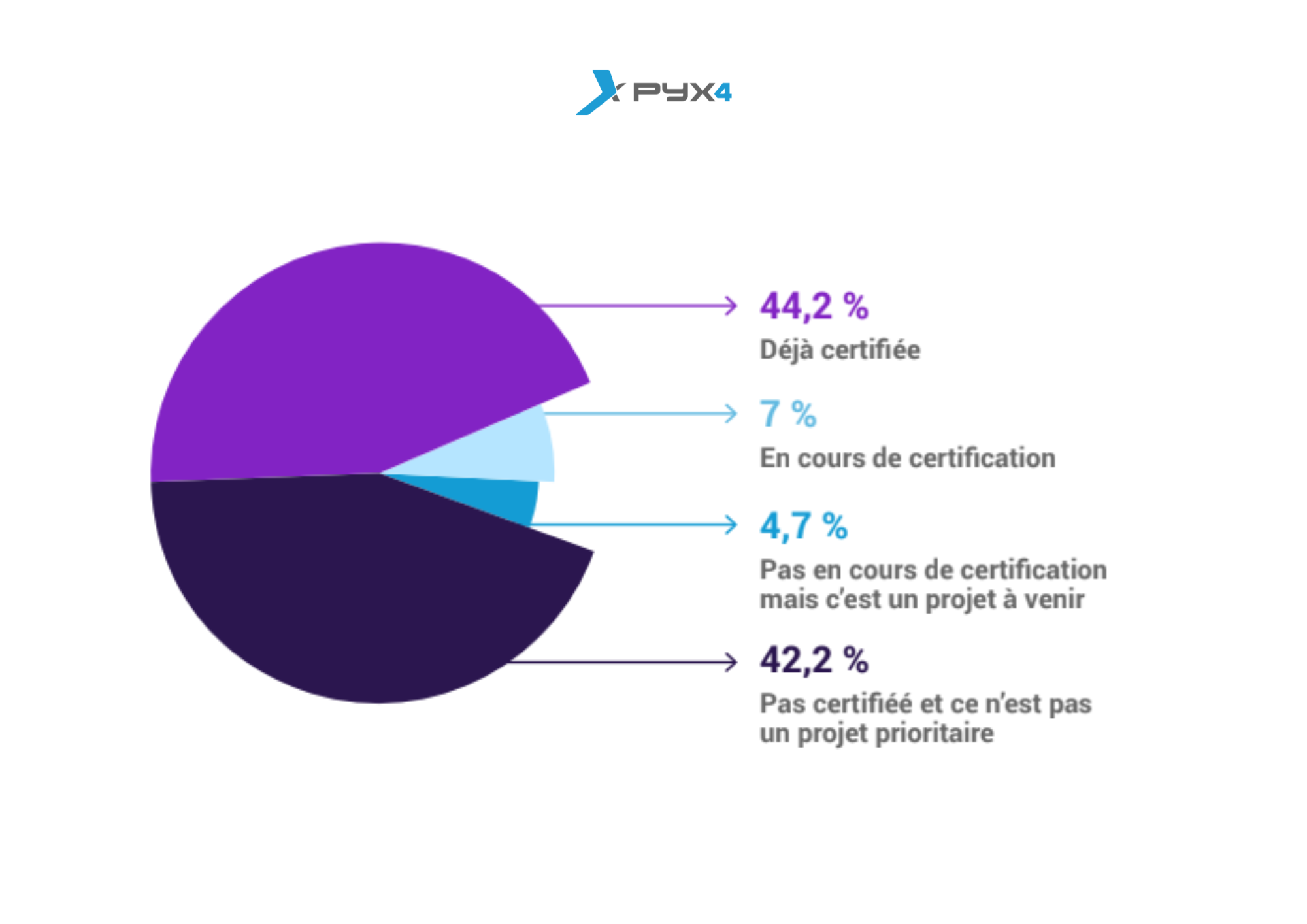Près de la moitié (49 %) des organisations publiques sont certifiées ou en passe de l’être (44 % certifiées et 7 % en cours). En revanche, 44,2 % ne disposent d’aucune certification et ne prévoient pas d’en obtenir. Un contraste marqué avec les organisations françaises, dont 73,5 % d’entre elles sont certifiées.