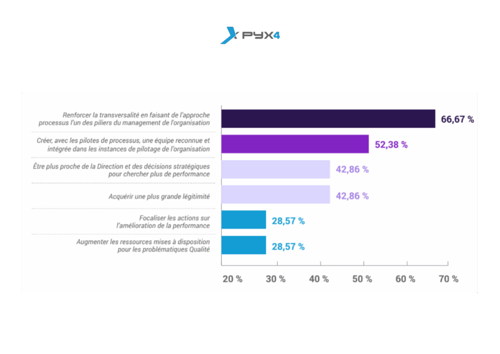 Les équipes Qualité cherchent à gagner en légitimité et à être mieux intégrées aux instances de pilotage de l’organisation. Pour cela, elles souhaitent renforcer la transversalité et se rapprocher de la Direction pour améliorer la performance de l’organisation.
